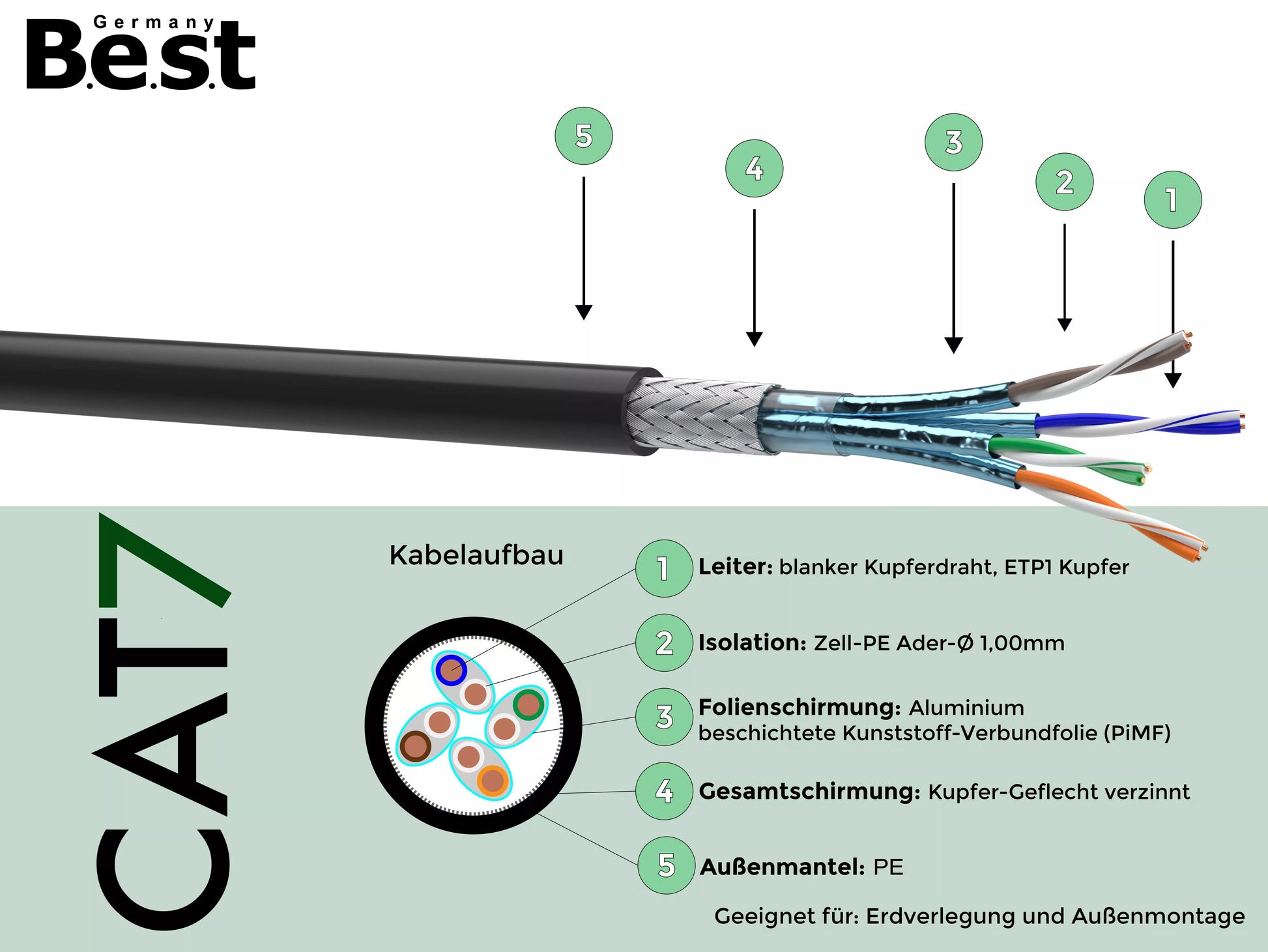 - Erdverlegbares CAT.7 Velegekabel mit starrem Kupferleiter AWG26 B.E.S.T-Germany Outdoor High-Speed Cat.7 doppelgeschirmtes S/FTP Datenkabel (PiMF)