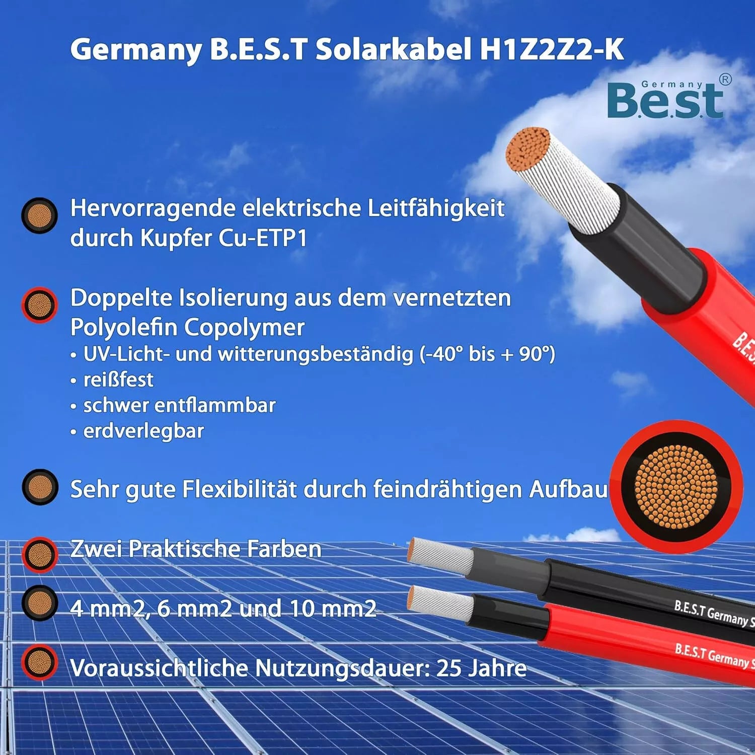 - Höchste Qualität für optimale Energieübertragung: Gemany B.E.S.T Solarkabel 4mm² bietet herausragende Leistung und Effizienz für eine zuverlässige Solarleitung in Photovoltaik Anlagen.